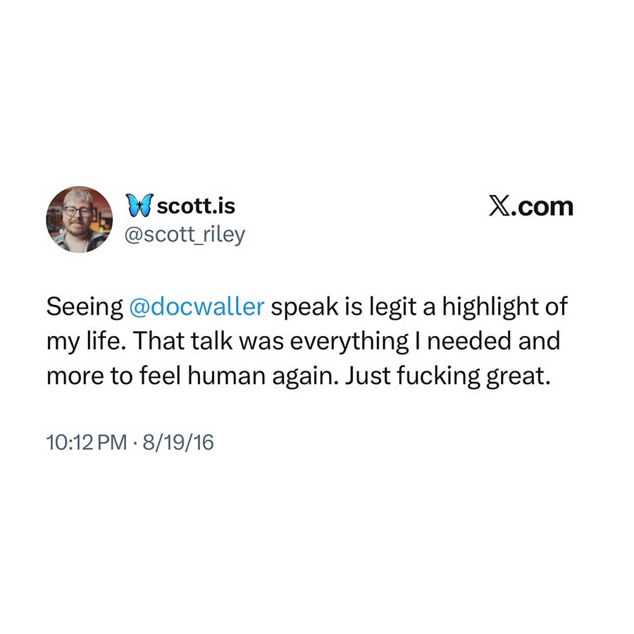 That said, I’m still proud of all my talks because they were honest and present. When you book me to speak, that’s what you’re getting: an honest speaker. A present speaker. A speaker who cherishes thoughtfulness and uses a magic bag of tricks learned in the theatre to make his point.